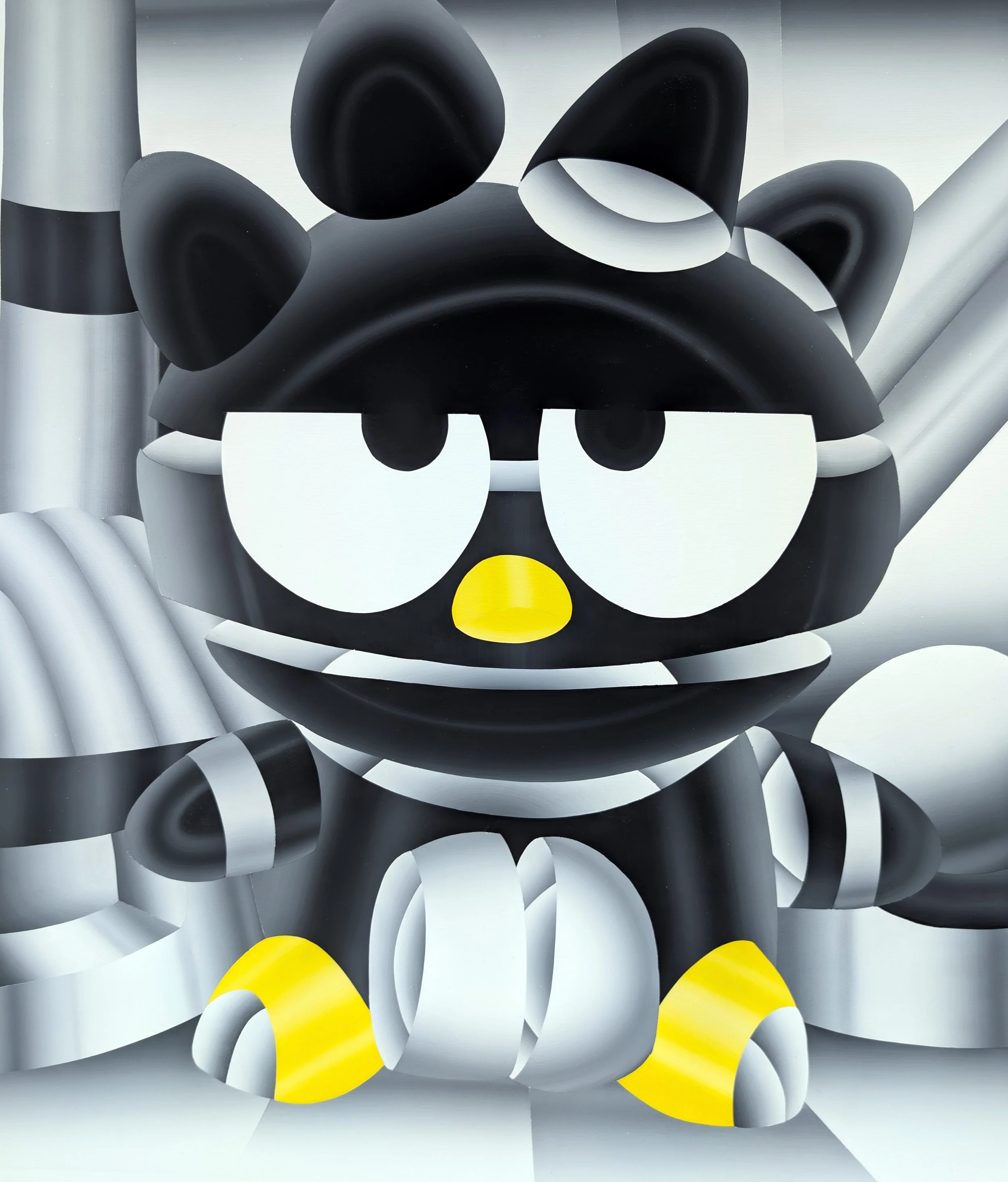 Abstract artwork featuring cartoonish, geometric shapes in pink, gray, and white, resembling a recognizable animated character.