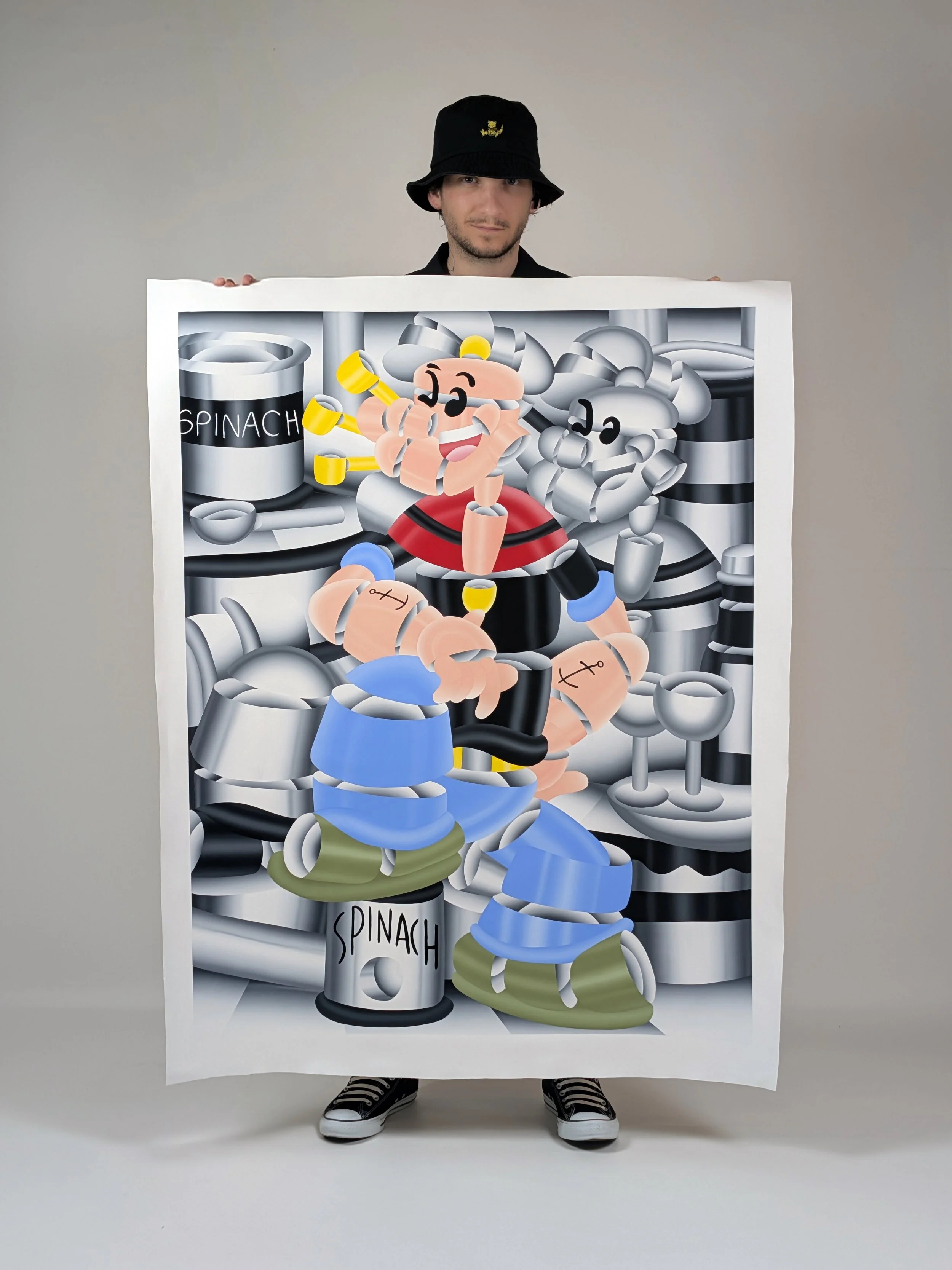 Person holding large cartoon art poster of cartoon characters and spinach can, wearing black hat and sneakers.