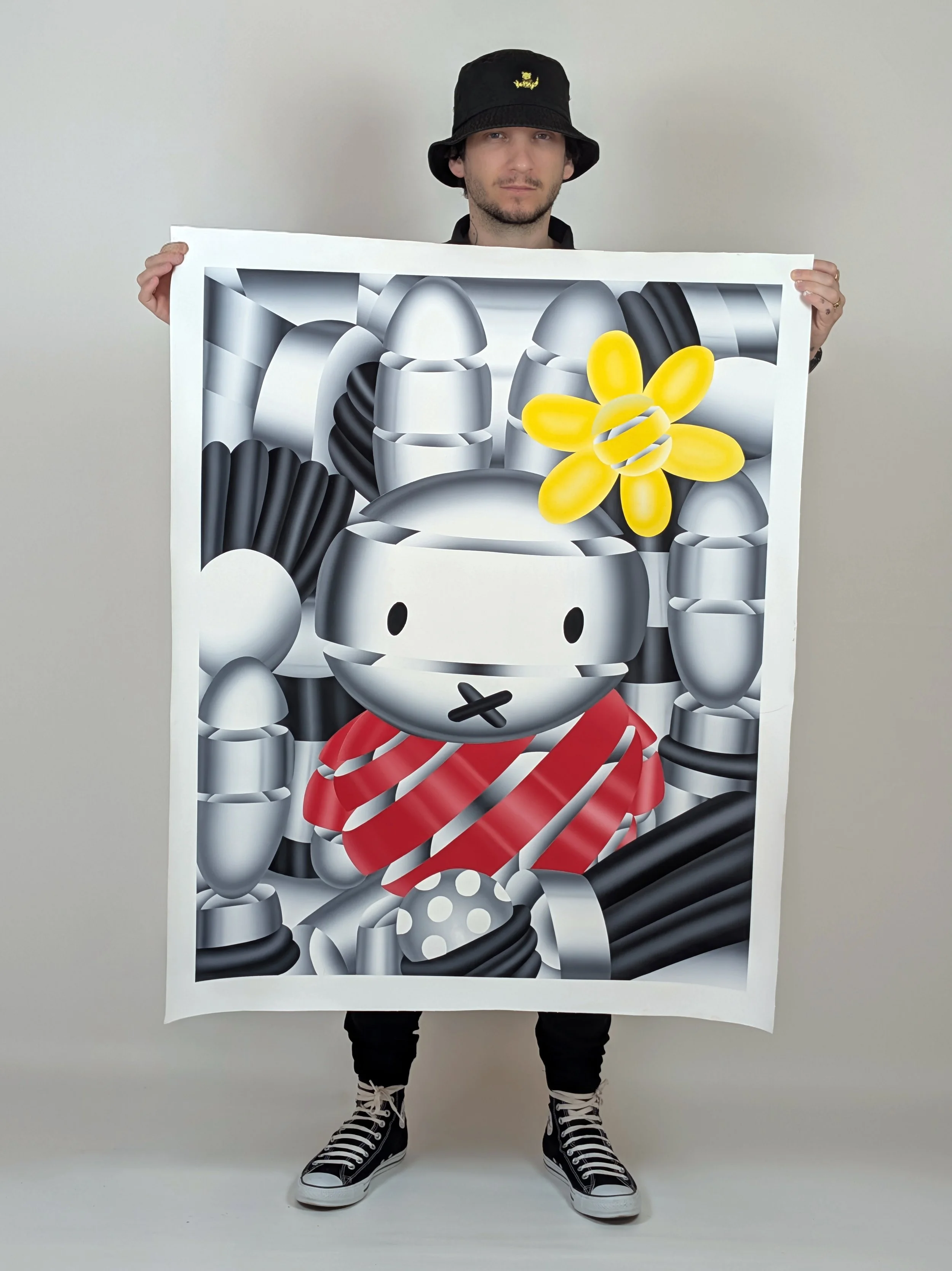 Person holding a colorful poster with a cartoon character, featuring silver and black elements, yellow flower design, and red-striped attire, standing in an abstract background.