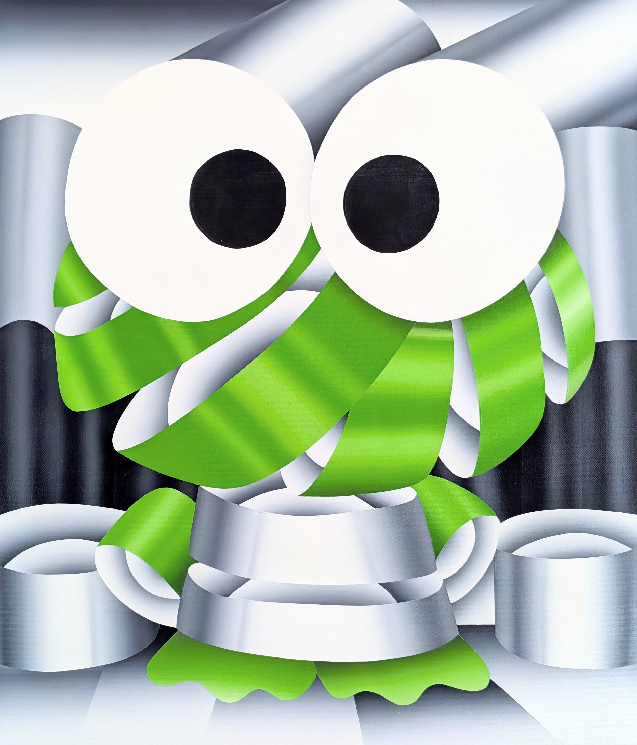 Abstract artwork featuring cartoon-like character with red and white segmented body and oversized eyes, set against a geometric background.