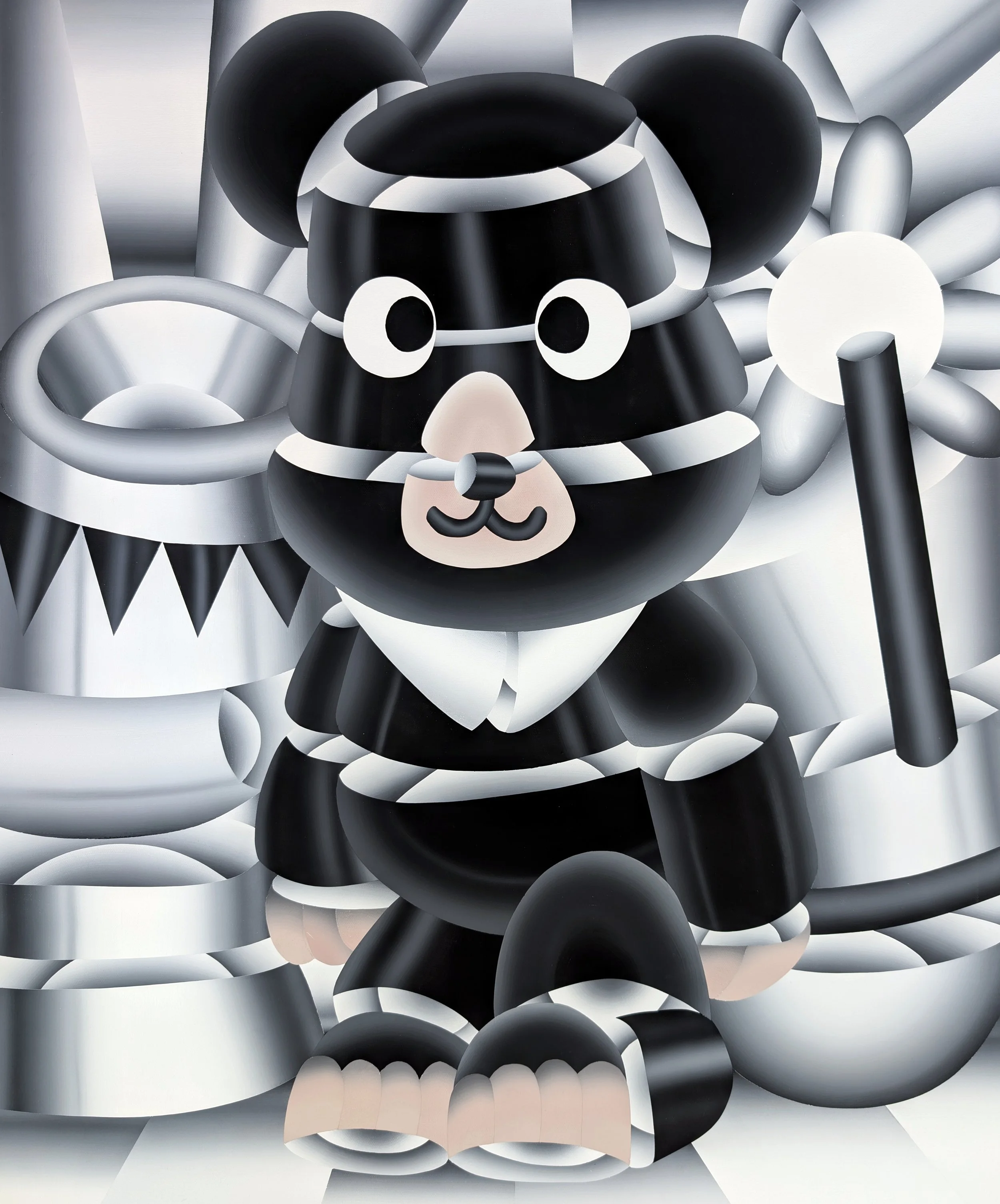 Abstract artwork of a black and white bear-like figure with geometric patterns
