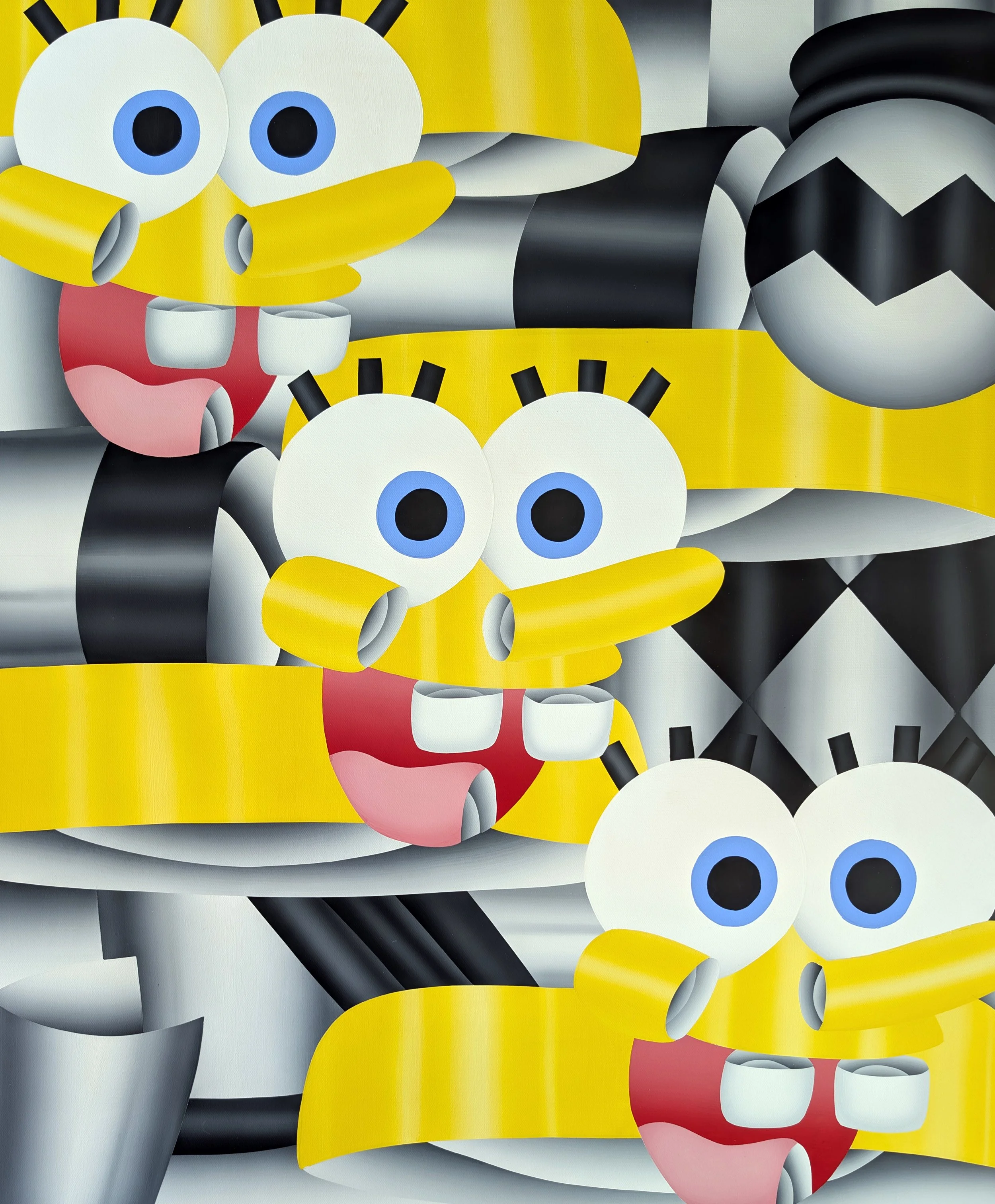 Abstract artwork featuring a stylized character with yellow and gray colors, resembling a popular animated character with red cheeks and a playful expression. The composition is made up of overlapping geometric shapes and spirals.