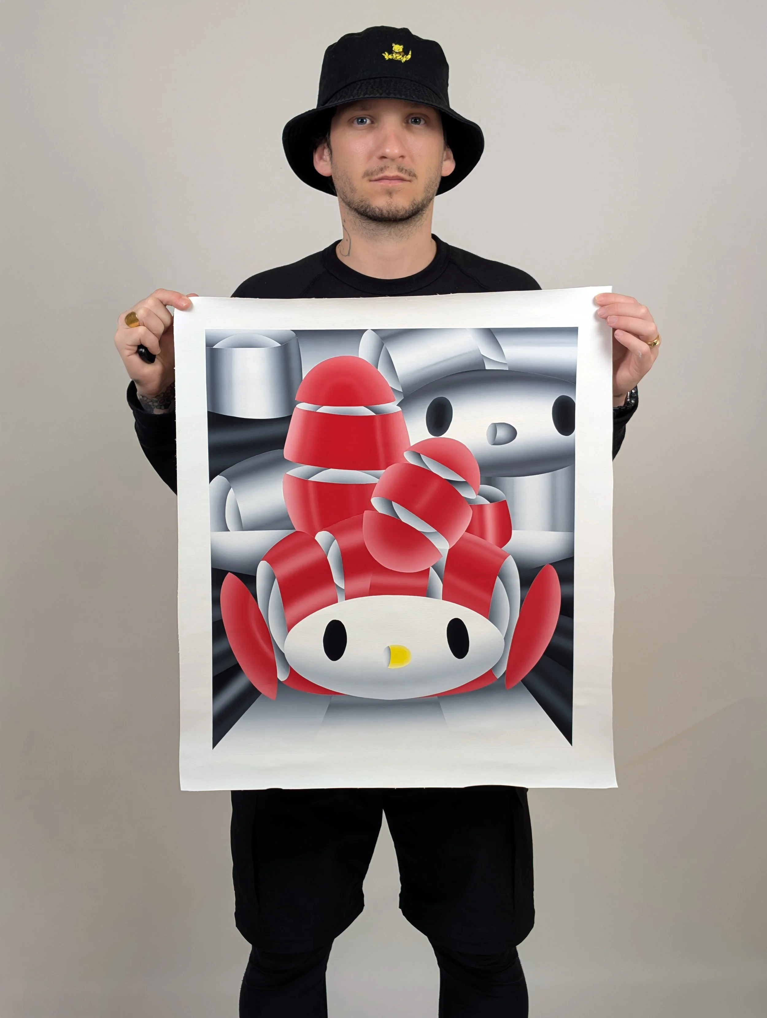 Person holding a print featuring a stylized character with red, helmet-like features and a white face, set against a geometric, metallic background. The person is wearing a black bucket hat with a yellow logo and a black outfit.