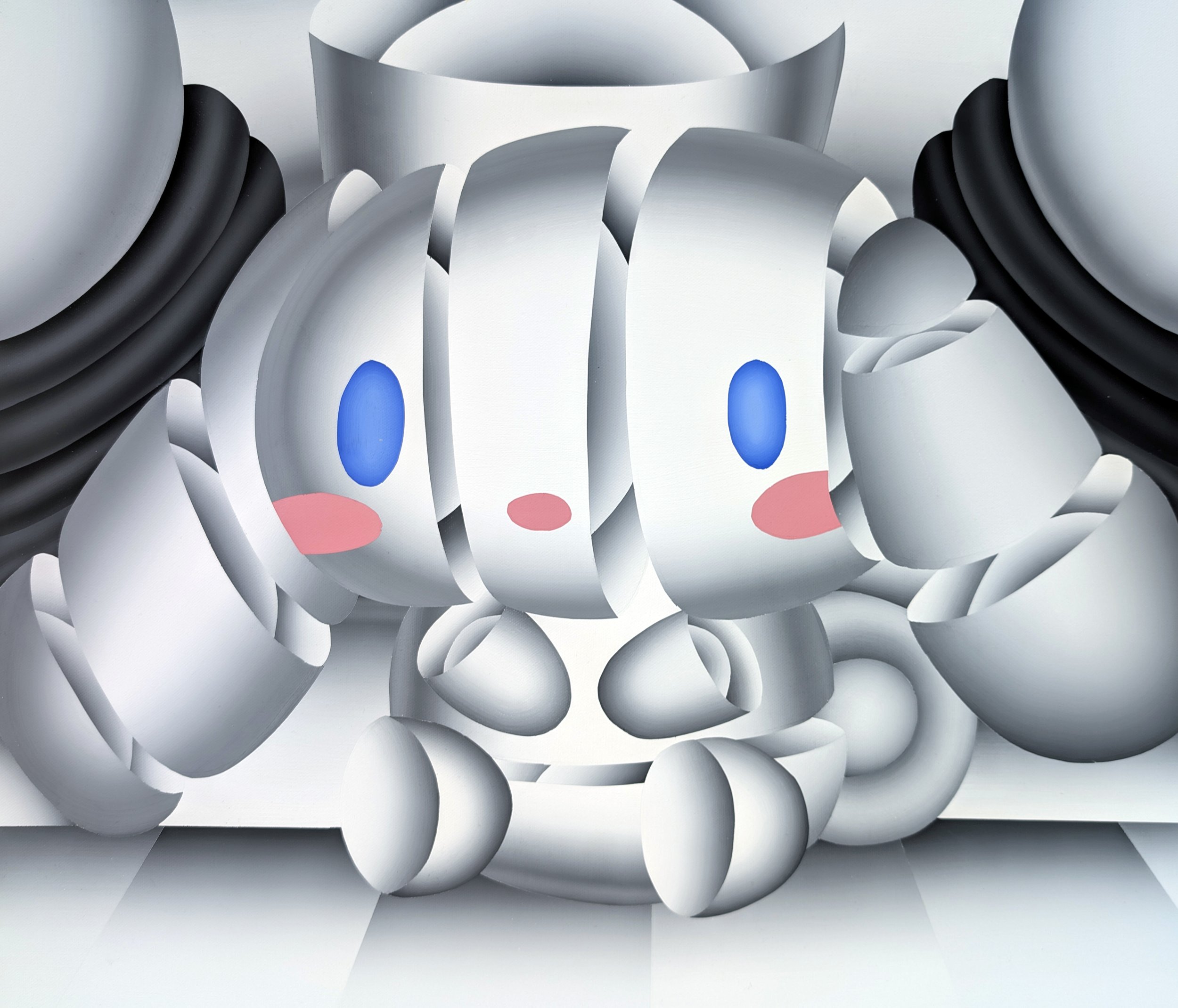 Abstract art depicting a character made of curved, segmented, white shapes with blue eyes and pink cheeks against a neutral background.