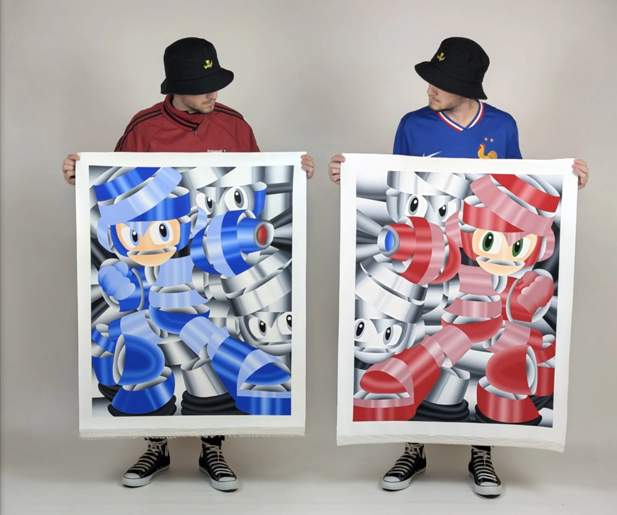 Two people holding art prints of cartoon-style robot characters, one blue and one red, with abstract metallic backgrounds, wearing matching hats and sneakers.