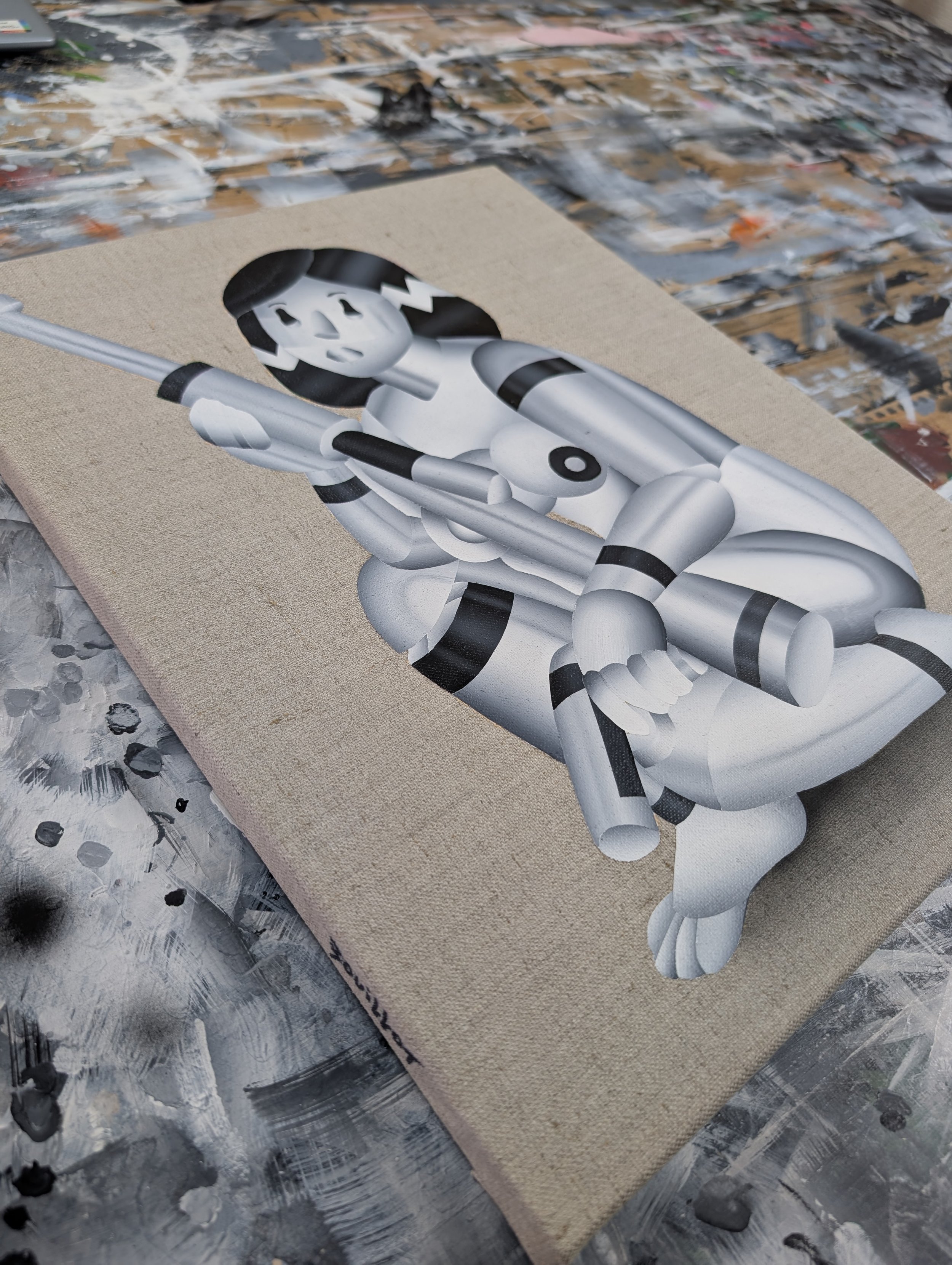 ❮ ❯ Panda Pot A playful still life—panda-face vessel overflowing with street flowers. Monochrome cylinders, edges in motion. 2024 — Acrylic on canvas 53.0 × 45.5 cm — Depth: 2 cm Price: $1,490