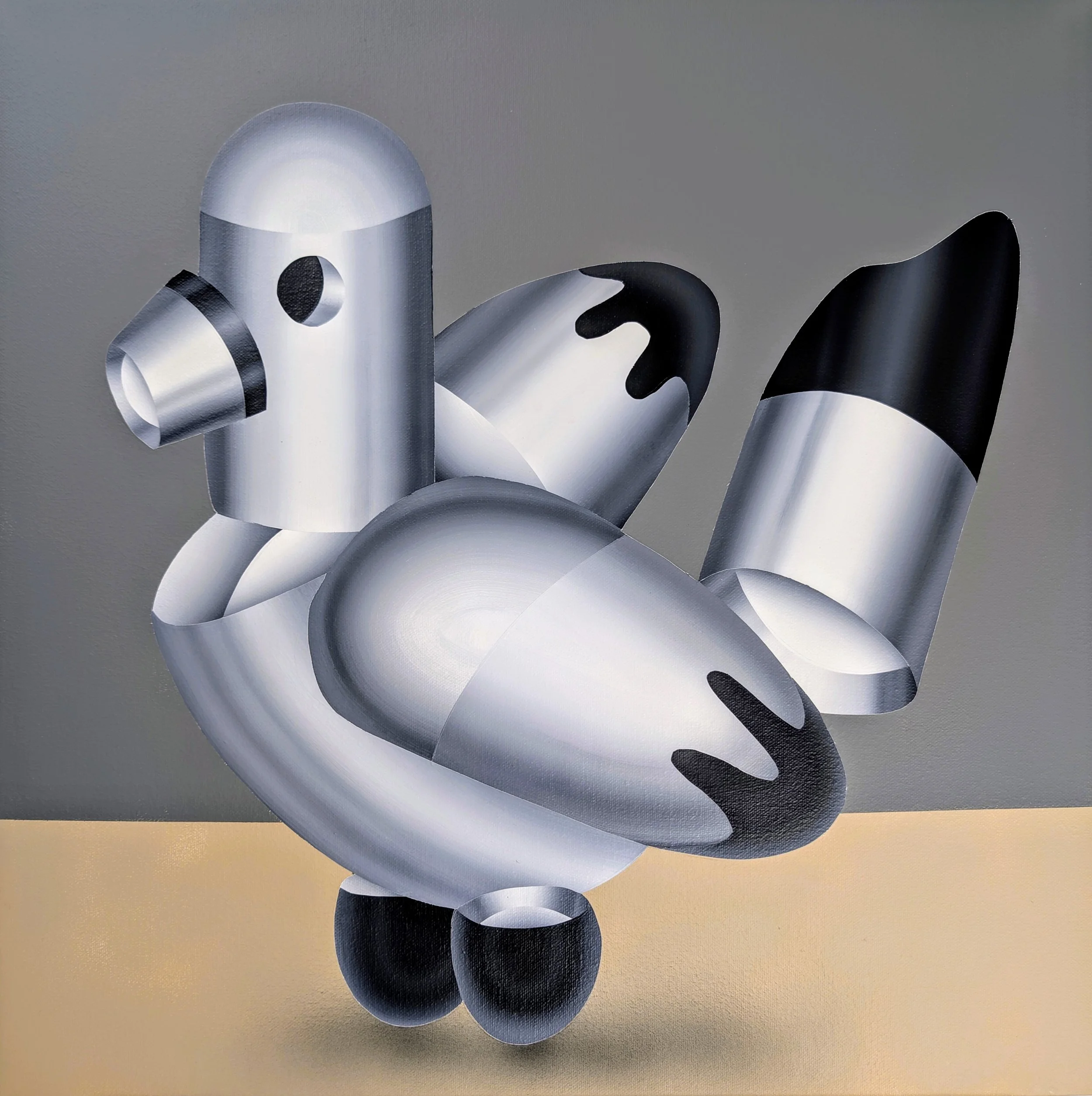 ❮ ❯ Petit Pigeon Between mechanics and nature. A modern interpretation of the urban symbol, recoded in monochrome cylinders. 2025 — Acrylic on canvas 46 × 46 cm — Depth: 2 cm Price: $1,290