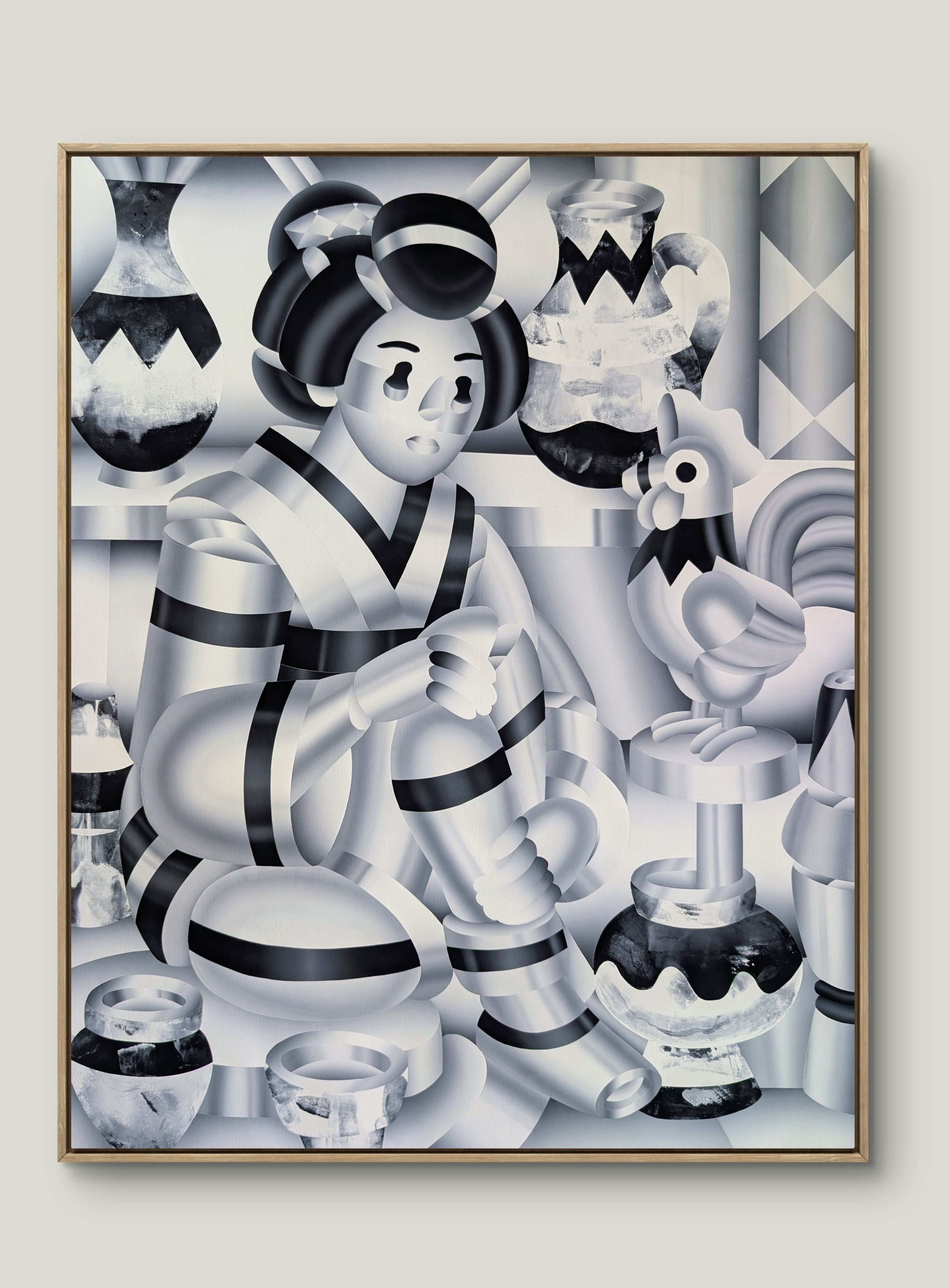 A quiet scene: geisha, rooster, and shelves of vessels.